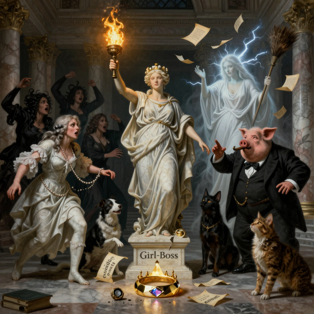 **Neoclassical Oil on Canvas (8K, Chiaroscuro Lighting):** In a vast marble atrium bathed in dramatic chiaroscuroâharsh golden torchlight carving deep shadows from the east, plunging the western recesses into inky voidâpersonified abstractions clash in frozen frenzy. At center, a regal Stay-Home Mom, draped in flowing classical robes evoking ancient hearth goddesses, cradles a glowing hearth-flame while trampling a shattered "Girl-Boss" pedestal; her face beams defiant triumph. Flanking her left, a stunned Liberal figure in tattered Enlightenment wig clutches pearls, eyes wide in horror, as shadowy Feminist Furies with serpentine hair whips recoil into darkness. To the right, Winston Churchill as a portly oracle-pig hybrid (tusked jowls, cigar clenched in hoof) gestures sagely amid adoring dogs and disdainful cats frozen mid-leer. Yoko Ono, ethereal in minimalist white shroud, sweeps away tumbling quote-scrolls with a broom of mindfulness, revealing a radiant Autodidact youth forging neural lightning-bolts from raw curiosity-books. In the foreground, a gleaming pentasilicon ring floats like a forbidden aromatic crown, encircled by wilting words "comely" and "homely" as ghostly relics; tradition's pale heritage ghost looms above, fanning pale gales against modernity's icy gale. Figures twist in Baroque tension, marble veins pulsing with ironic vitality, every fold and shadow screaming cultural eclipse in opulent decay.