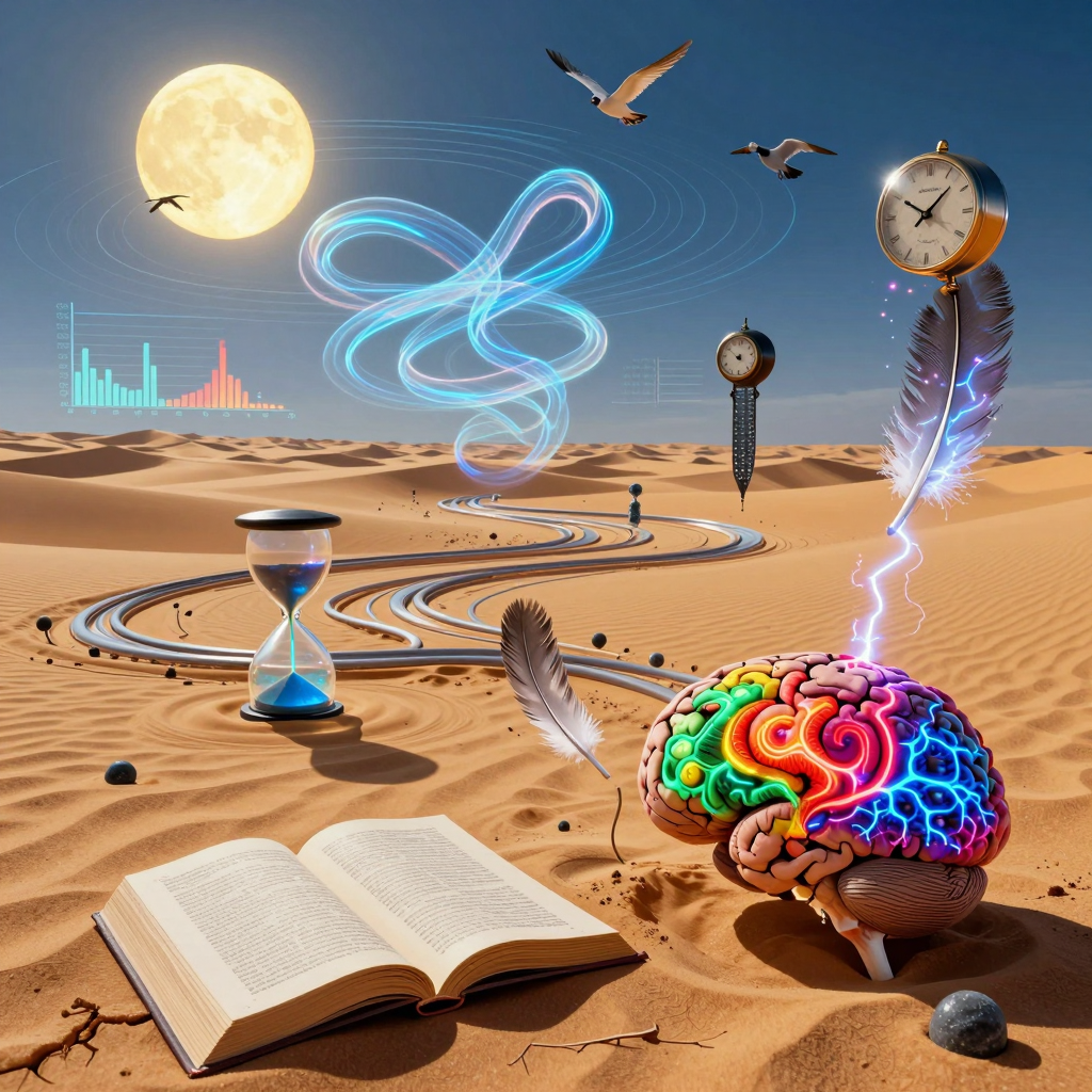 A surrealist high-fidelity 8K desert landscape in the style of Salvador Dali fused with data visualization: endless golden dunes stretch under a warped, dual-sun sky where Earth's magnetic field lines manifest as shimmering, translucent blue ribbons twisting into impossible knots. Floating above the sands, melting pigeon feathers drip into hourglass-shaped semicircular canals filled with swirling, electrified fluid that sparks with tiny lightning bolts representing induced currents. Hair cells with bristling antennae emerge from cracked, book-like brains half-buried in the sand, their pages unfurling into c-FOS-stained neural maps glowing with heatmap gradients of brain activity—vestibular nuclei pulsing red, mesopallium in emerald swirls, hippocampus as a labyrinthine rose. Magnetite crystals hover as melting black clocks, their hands bending toward magnetic north, while cryptochrome eye-orbs dangle from elongated pigeon beaks like forgotten pendulums, dissolving into voltage-gated ion channel fractals that pulse with data streams. Distant horizons warp with homing pigeon silhouettes scanning the void, their shadows casting bar graphs of field intensity and inclination, all under a persistent mirage of rotating 150-microtesla coils amid baroque, vein-like conduits threading the scene.Video (LTX):