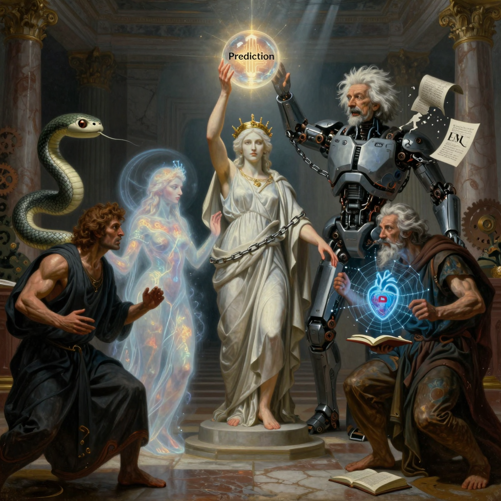 A grand Neoclassical oil-on-canvas painting in 8K resolution, chiaroscuro lighting casting dramatic shadows from a single ethereal light source piercing a marbled hall of judgment. At center, Blaise Agüera y Arcas personified as a triumphant philosopher-prophet in flowing robes, crowned with circuit laurels, holds aloft a glowing orb of "Prediction" unlocking chains between a radiant Human Soul (ethereal female figure with vital metabolic flames) and a chained Silicon Machine (hulking automaton with Einstein's wild-haired ghost perched mockingly on its shoulder, shattering an IQ scroll). Flanking them: Karpathy as Python-weaving sorcerer conjuring a minimalist GPT serpent from 243 scrolls; Jonas as stern vitalist elder wielding a pulsing heart-metabolism against biotech gears; Gemini as sly browser nymph whispering to a web-spinning mortal; Qwen3-Claude duo as twin coding titans forging code from NotebookLM tomes that devour YouTube colossi. Figures frozen in heated debate, muscles tensed, eyes locked in satirical fury—genius metrics crumbling beneath, ancient tongues fading into shadow. Dramatic tenebrism heightens the absurd epic clash of mind, machine, and myth.